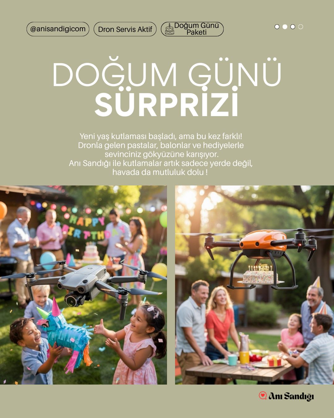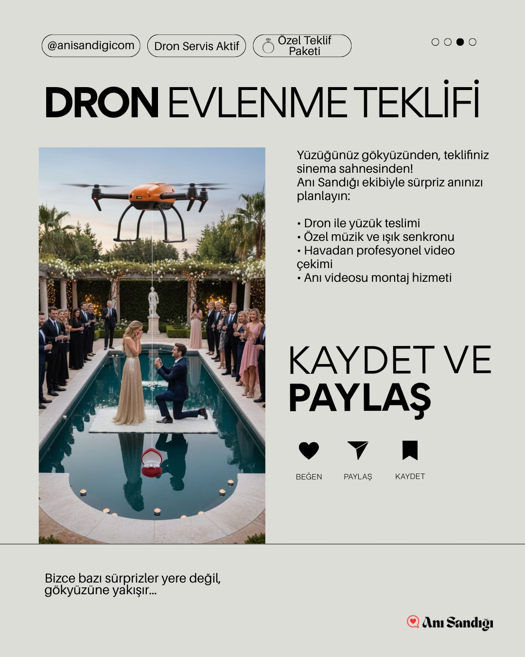 - Hayatınızın en unutulmaz sürprizini (evlilik teklifi, özel hediye veya doğum günü kutlaması) drone teknolojisiyle gökyüzüne taşıyoruz.